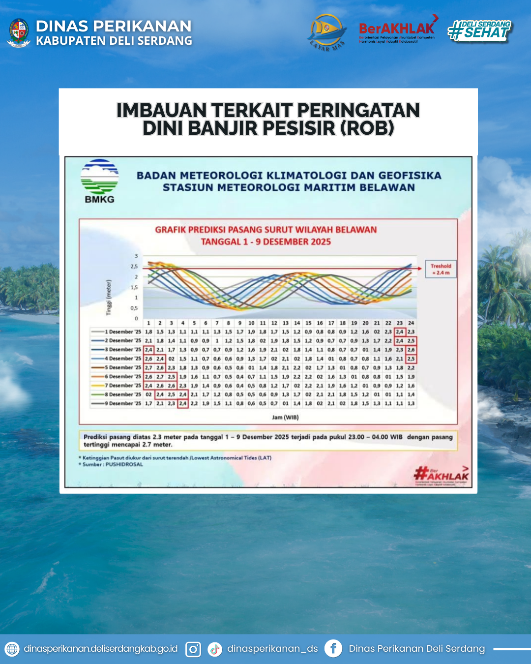Pemerintah Kabupaten Deli Serdang melalui Dinas Perikanan Kabupaten Deli Serdang menghimbau kepada seluruh masyarakat pesisir untuk meningkatkan kewaspadaan terhadap potensi banjir pesisir (rob) yang dapat terjadi akibat kondisi pasang air laut di wilayah Belawan dan sekitarnya yang diprediksi pada tanggal 1-9 Desember 2025.