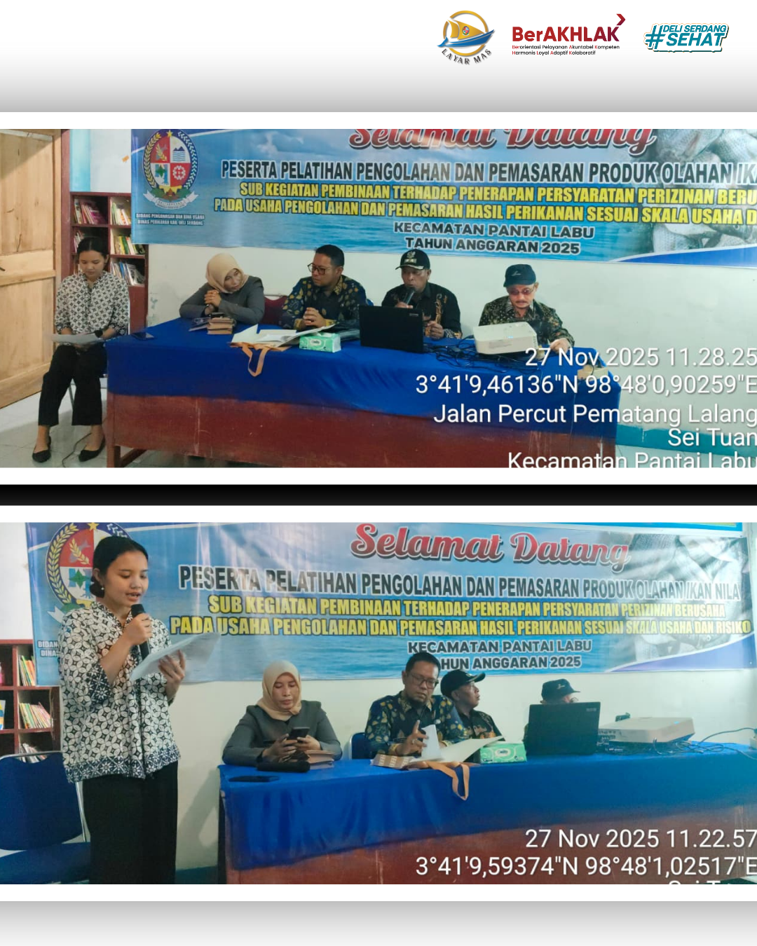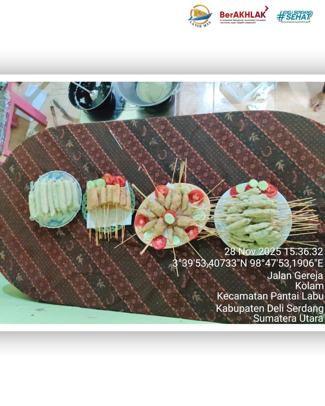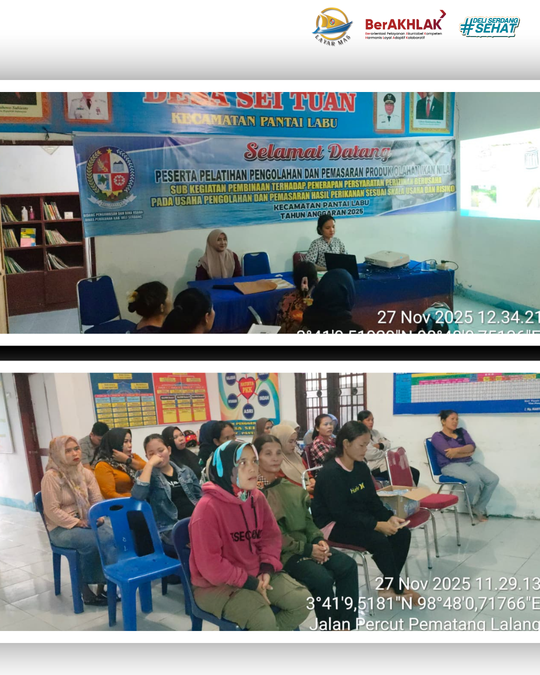 Dinas Perikanan Kabupaten Deli Serdang melaksanakan kegiatan Pelatihan Pengolahan Ikan Nila menjadi produk olahan bernilai tambah, yaitu nugget dan sempol, pada Kamis–Jumat, 27–28 November 2025 di Desa Sei Tuan, Kecamatan Pantai Labu.